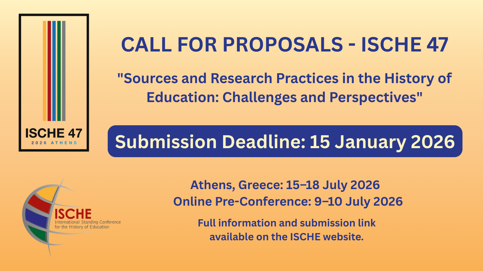 ISCHE, the Department of Education at the University of Athens, and the Greek Education Historians Society invite researchers to participate in the 2026 International Standing Conference for the History of Education. The conference will take place on the university campus in Athens from 15-18 July 2026, preceded by an online pre-conference on 9-10 July 2026.